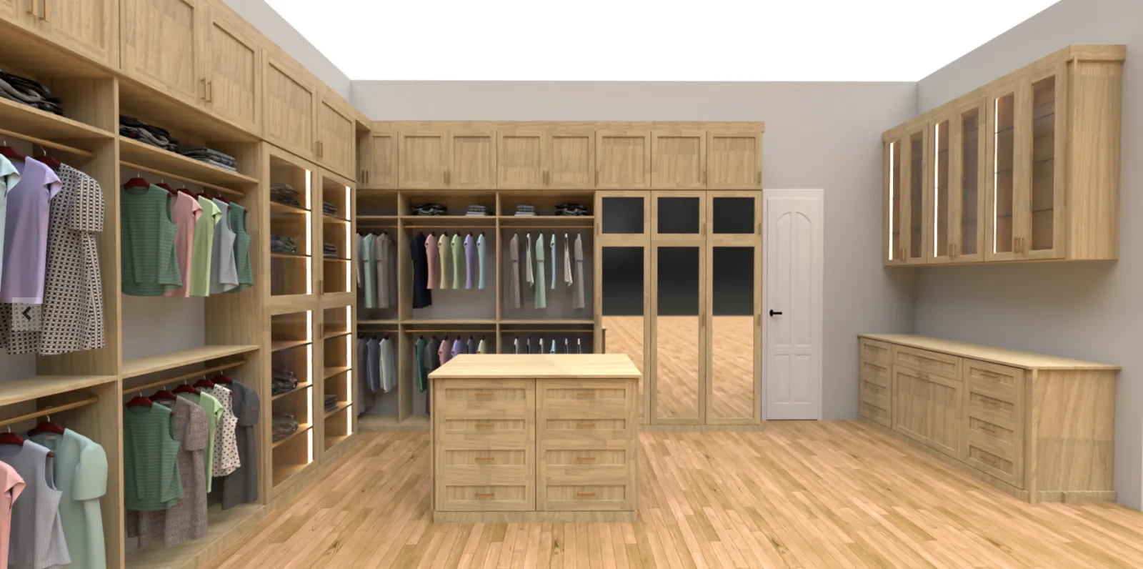 - Design the closet using exact measurements and taking all of the measurements for each type of clothing and shoes under consideration. This will be very time consuming without the 3D CAD design software that closet designers use and without the years of experience that closet designers have designing closets.